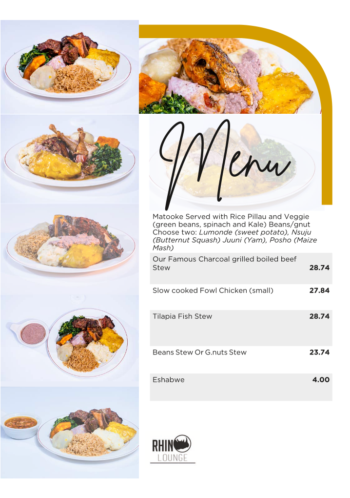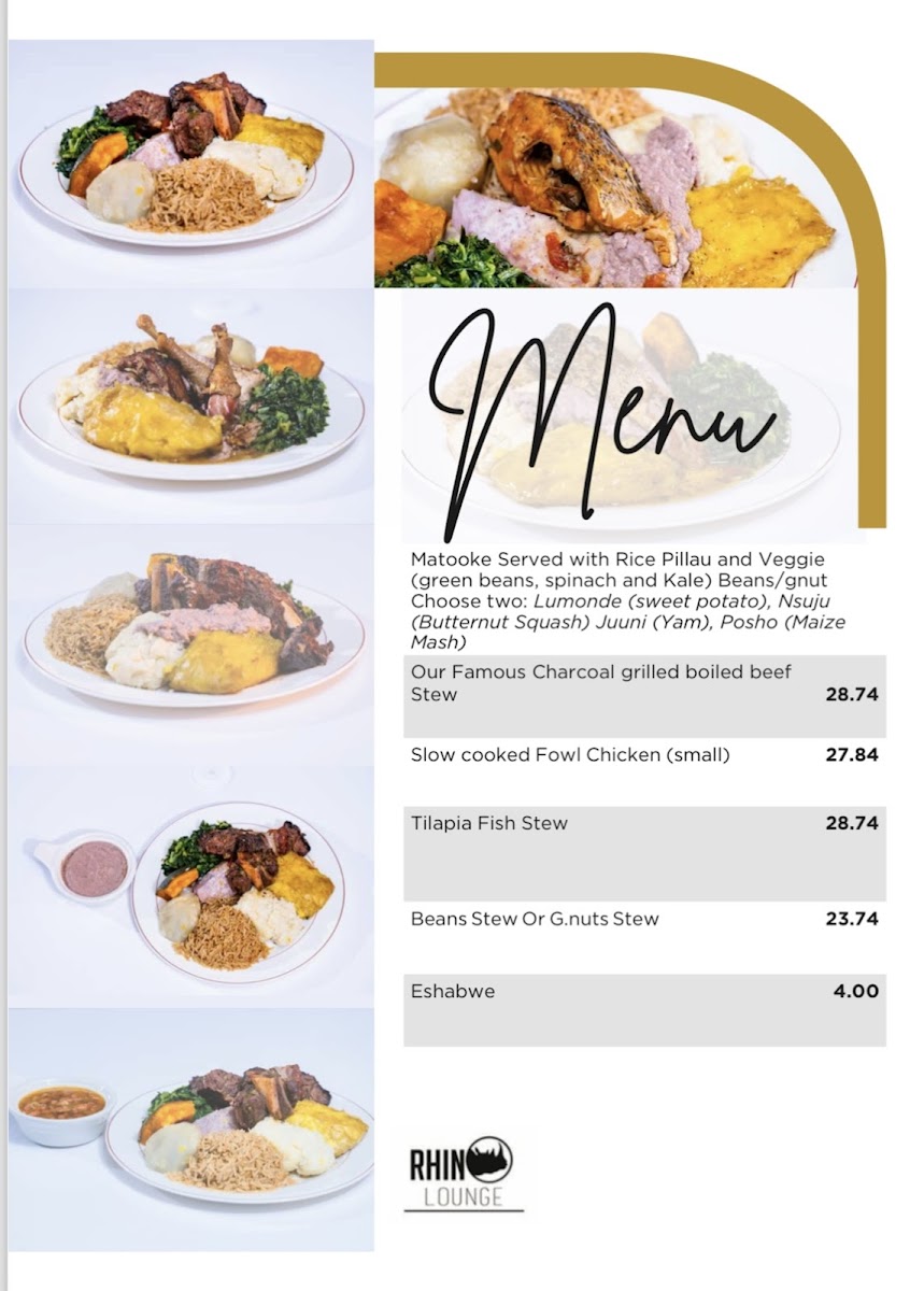 Welcome to Rhino Restaurant & Lounge, a culinary gem nestled in Waltham, Massachusetts. This vibrant eatery celebrates East African cuisine, offering a menu that is both diverse and mouthwatering. Start your day with the Breakfast Combo or the unique Rhino Rolex, a chapati rolled with eggs. The quick menu features sides like yuca fritters and fried plantains, perfect for pairing with your main courses.